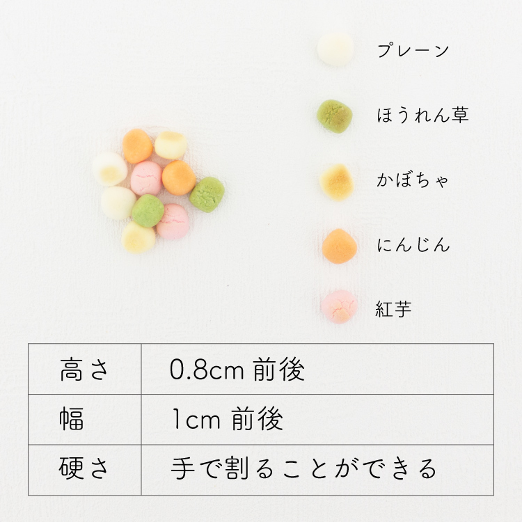 - 馬鈴薯澱粉、人参、かぼちゃ、ほうれん草、紅いも、粉末カルシウム、メレンゲ、蜂蜜、エゾウコギエキス